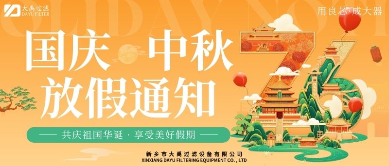 尊敬的客戶及合作伙伴:秋風送爽,丹桂飄香。值此國慶與中秋雙節來臨之際,謹向您及家人致以zui誠摯的節日祝福!根據國家法定節假日安排,結合公司實際情況,現將2025年國慶+中秋雙節放假安排及相關事項通知如下:一、放假時間2025年10月1日(星期三)至10月6日(星期一),共計6天。10月7日(星期二)起正常上班。9月28日(周日)、10月12日(周日)補班。二、業務服務說明放假期間,公司線上咨詢通道保持暢通。銷售人員將不定期查看并回復您的咨詢,但受假期影響,可能存在回復延遲的情況,敬請諒解。如遇緊急事項,您可撥打以下熱線:王經理13613905650;李經理13839073363,我們將竭誠為您服務。三、生產安排提醒因車間節前生產訂單已排滿,為確保假期前后生產質量與效率,放假期間(10月1日至10月6日)將暫停安排新生產訂單生產。節前已下單的訂單將按原計劃正常推進,放假期間新接訂單將統一順延至10月7日復工后,按序安排生產。由此帶來的不便,我們深表歉意,感謝您的理解與支持。四、溫馨提示假期出行請注意安全,做好個人防護。公司官網及社交媒體平臺將持續更新節日動態及服務資訊,歡迎隨時關注。佳節共團圓,服務不間斷。值此雙節同慶的美好時刻,衷心感謝您長期以來對我司的信任與支持!我們期待在節后以更飽滿的熱情、更優.質的服務與您攜手同行,共啟新程!此致敬禮!新鄉市大禹過濾設備有限公司2025年9月28日